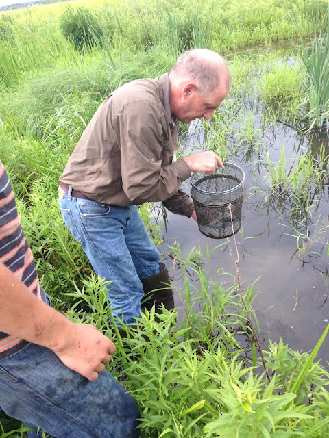 Here, Tom checks a minnow trap. We collected a lot of crayfish and various tadpoles in these.